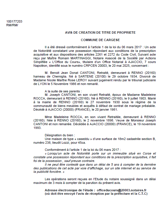 Avis de creation de titre de propriété - Commune de Carghjese - Cantoni.pdf