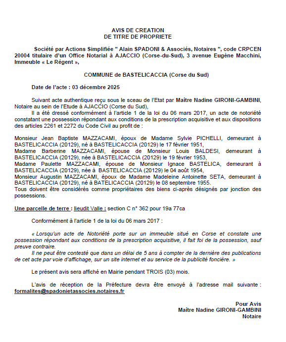 Avis de création de titre de propriété - Commune d'A Bastilicaccia - Mazzacami