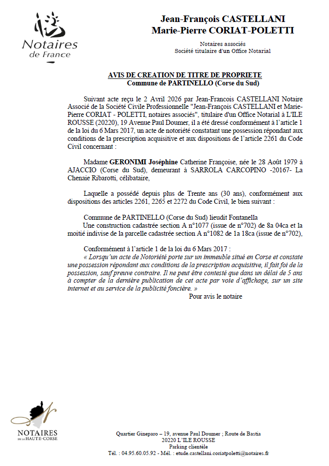 Avis de creation de titre de propriété - Commune de Partinellu - Geronimi.pdf